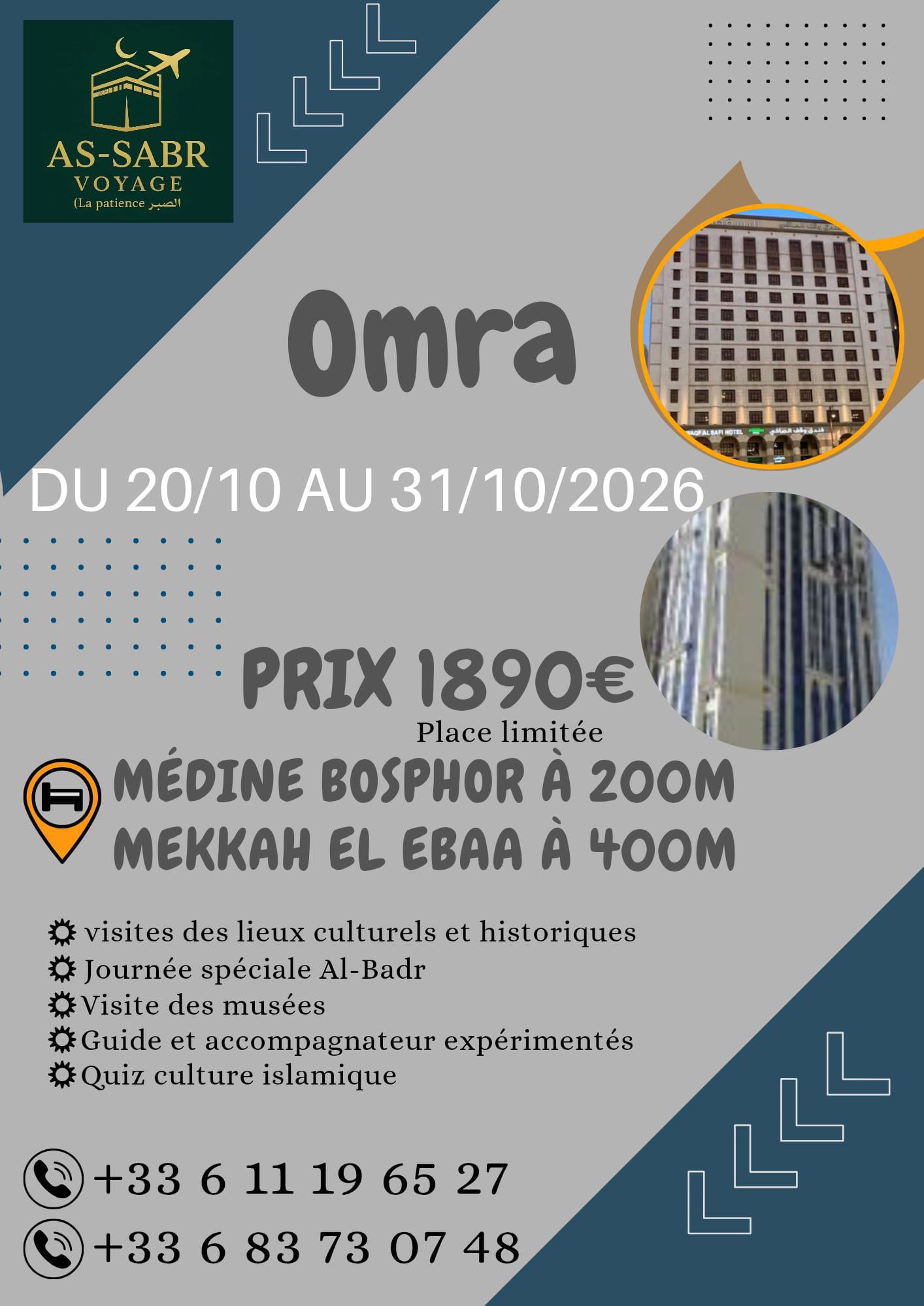 AS-SABR VOYAGE propose trois offres spéciales pour des pèlerinages Omra (Umrah) en Arabie Saoudite, ciblant différents groupes d'âge ou publics généraux. Ces voyages incluent des hébergements à proximité des sites sacrés, des visites guidées et des activités culturelles.
